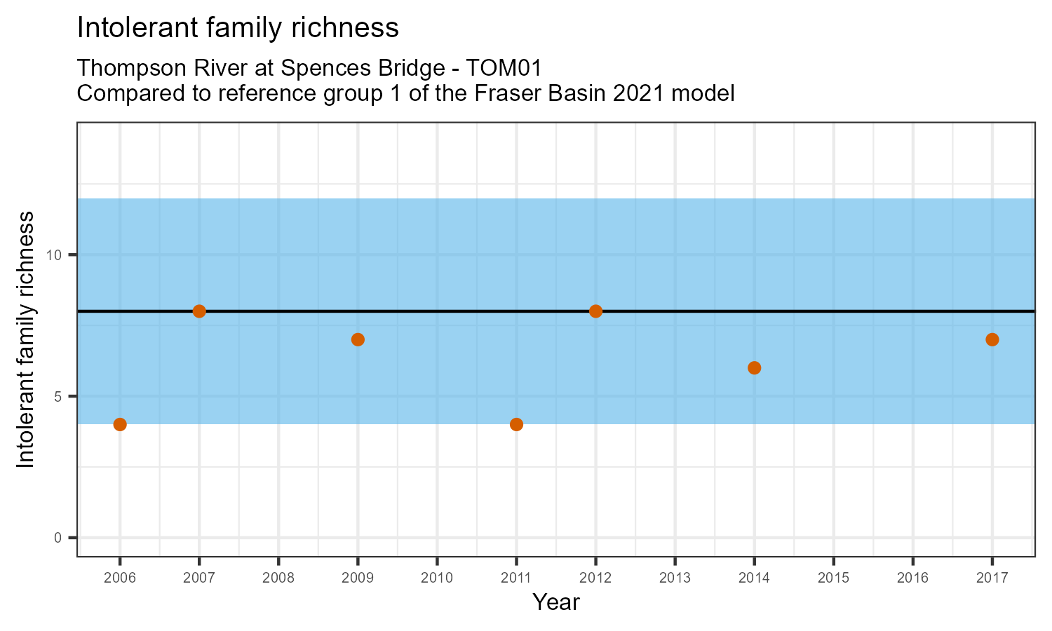 Intolerant family richness counts the number of taxonomic families that are sensitive (intolerant) to pollution, according to the Hilsenhoff Biotic Index. Intolerant family richness may decrease as water pollution increases.