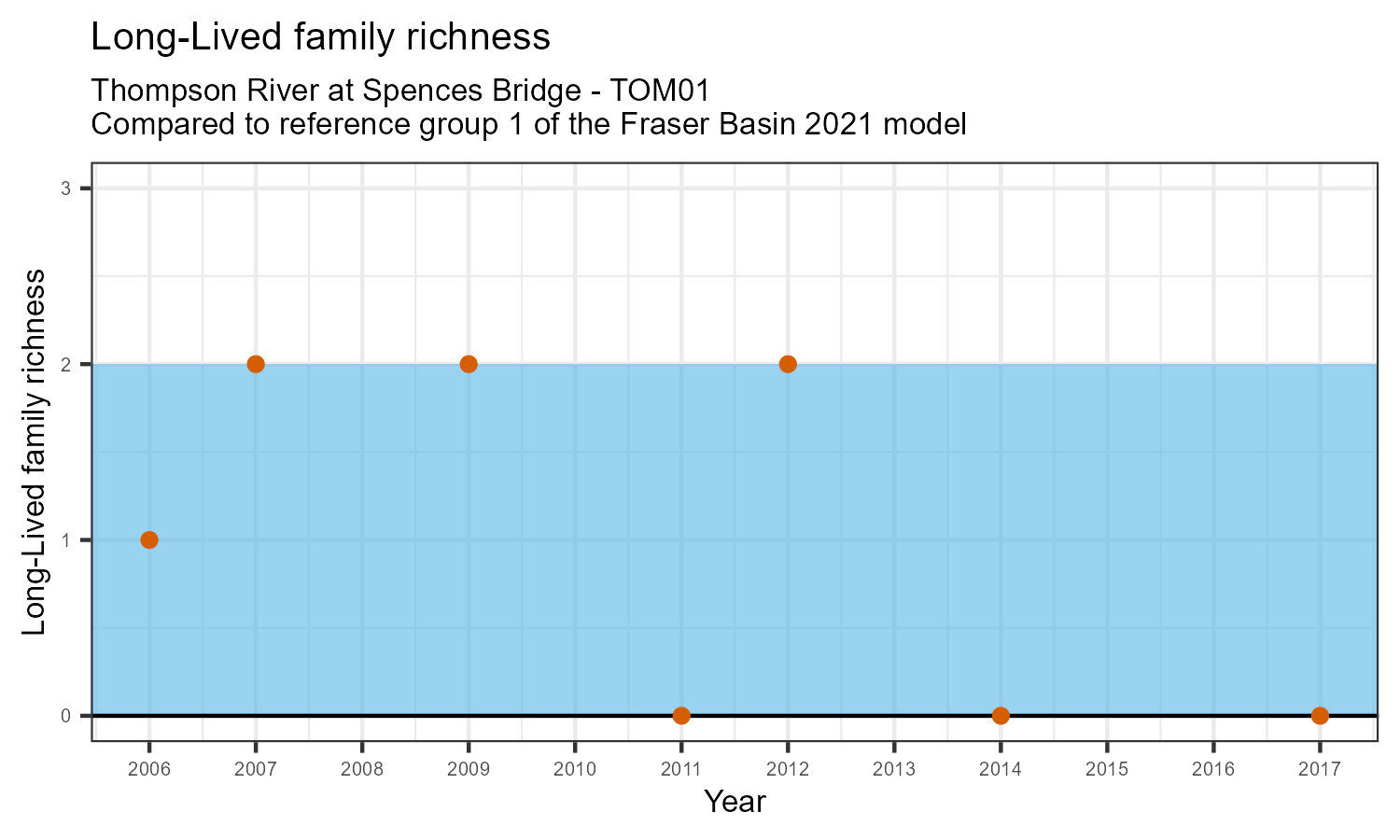 Long-lived family richness counts the number of taxonomic families that need more than 1 year to complete their life cycle. These families have been exposed to conditions in the water over a longer period. They provide information on historical and current water quality conditions. The number of long-lived families may decrease in response to habitat disturbances like poor water quality.