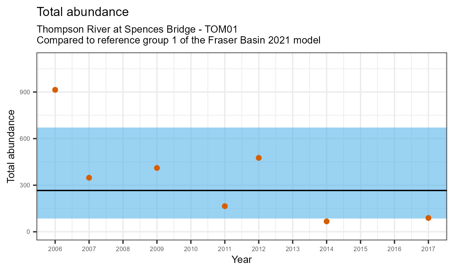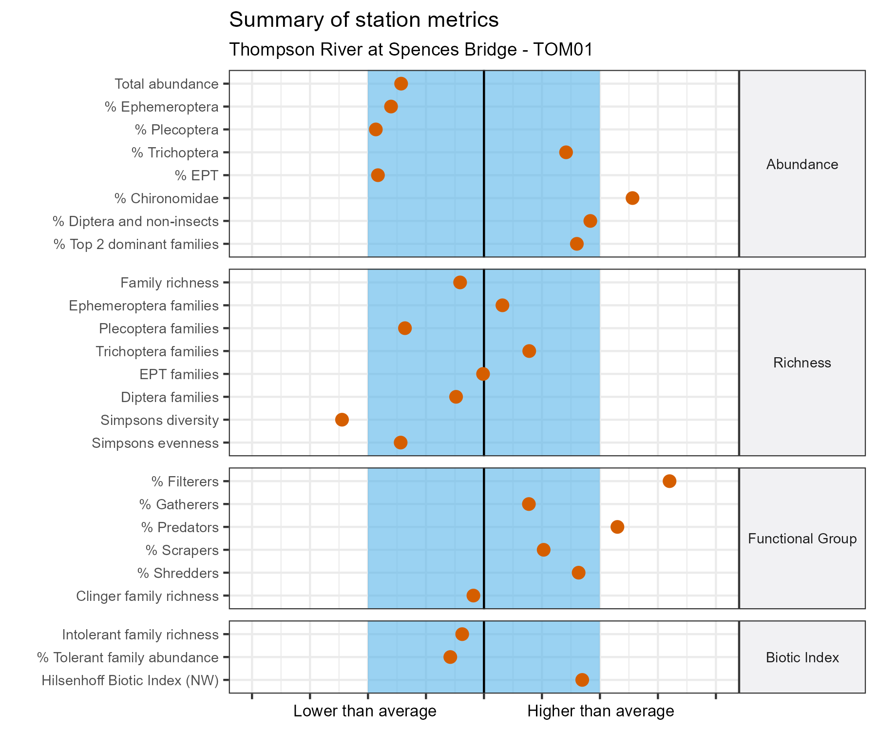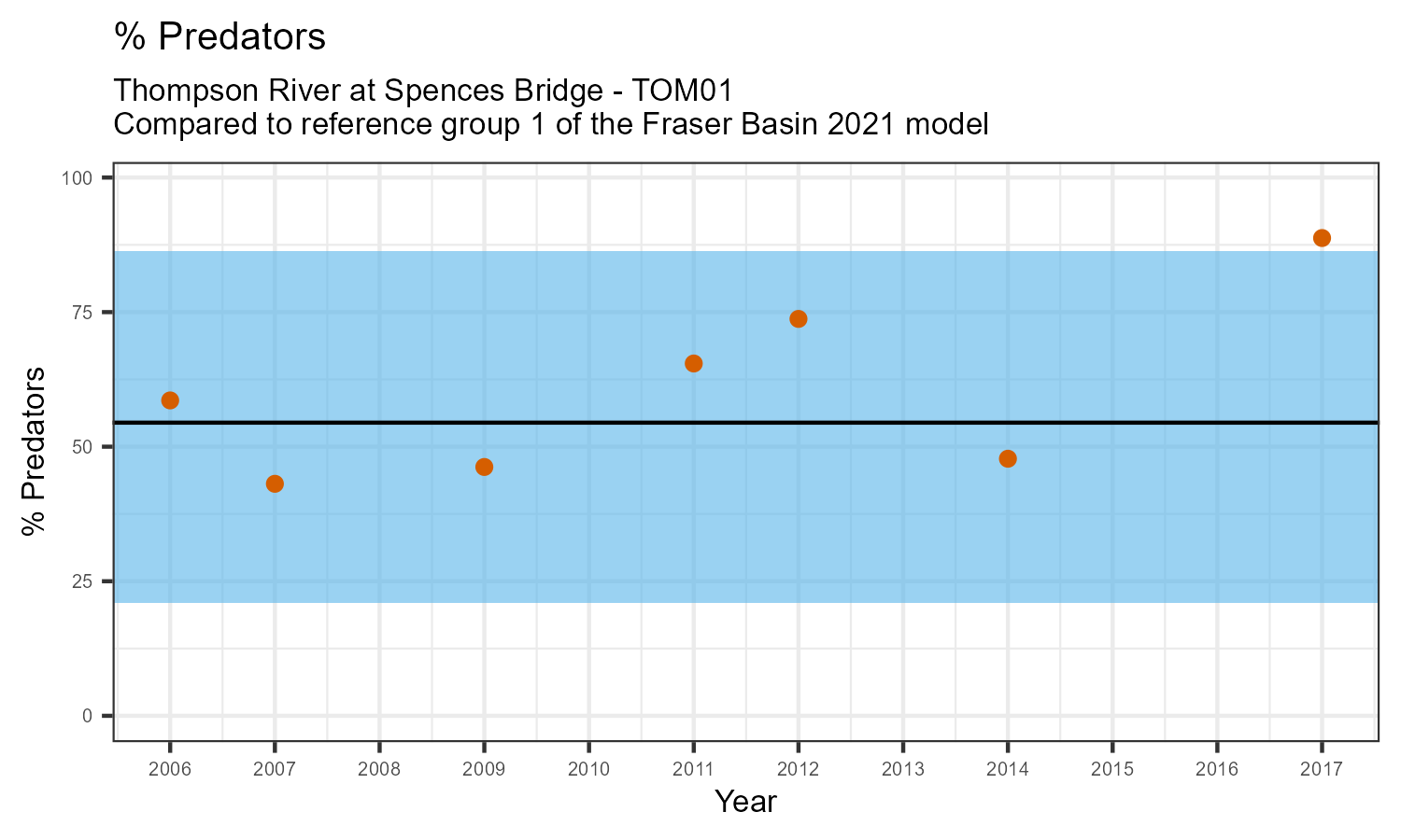 For each metric shown in the graph, the value at this station has been standarized by the standard deviation of the values from the relevant reference model group (in this case, Group 1 of the Fraser Basin 2021 reference model). The black line represents the mean value for that metric in the reference group. The blue bar represents two standard deviations of the reference group above and below the mean.