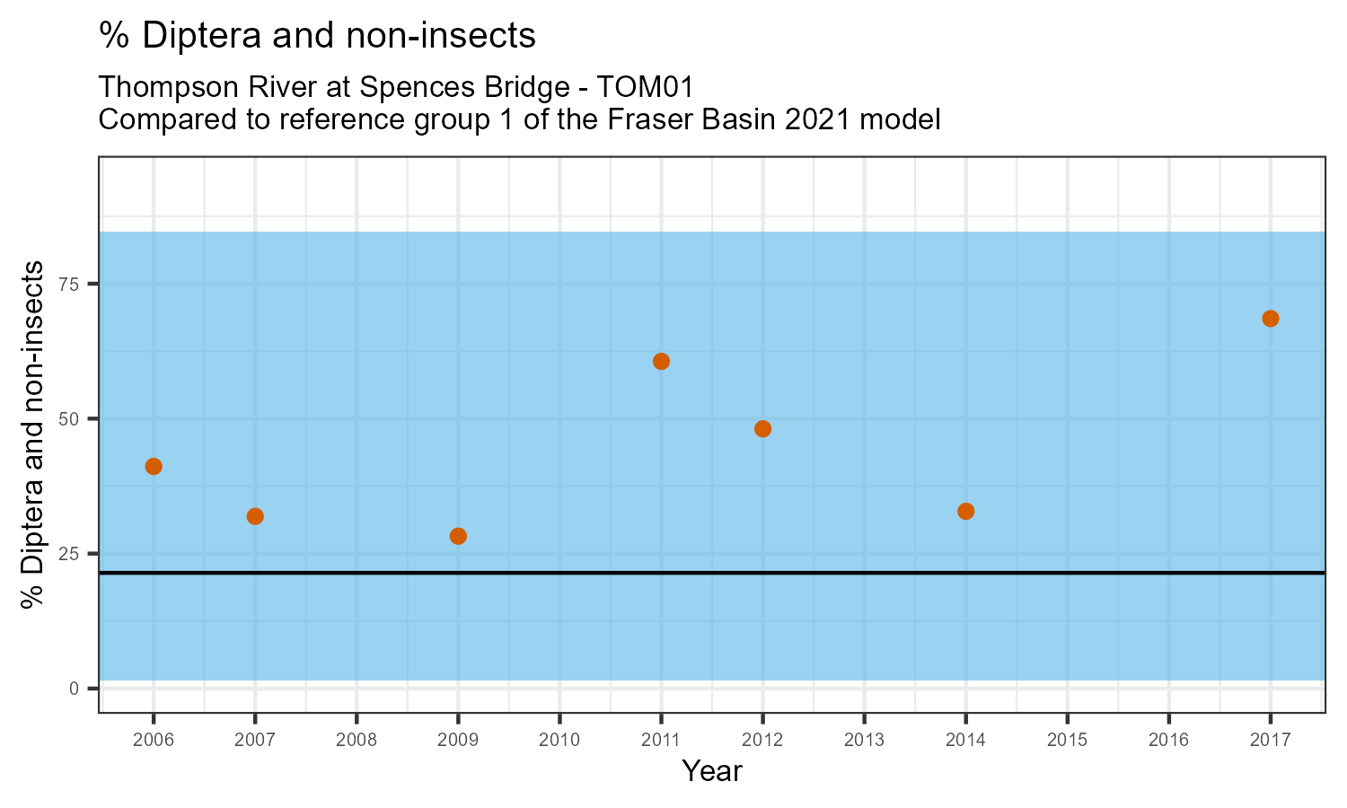 % Diptera and non-insects is the proportion of invertebrates that either are not insects, or are insects in the taxonomic order Diptera. Diptera are flies, and along with non-insects they represent the more pollution tolerant members of the aquatic community. The % Diptera and non-insects may increase in response to habitat disturbances like poor water quality.