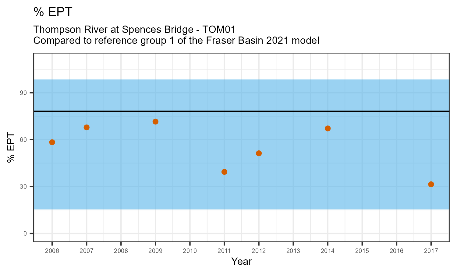 % EPT is the proportion of invertebrates that belong to one of the taxonomic orders of Ephemeroptera (mayflies), Plecoptera (stoneflies), or Trichoptera (caddisflies). These types of insects are often grouped together under the term “EPT”. They are typically the most sensitive to habitat disturbances like poor water quality.