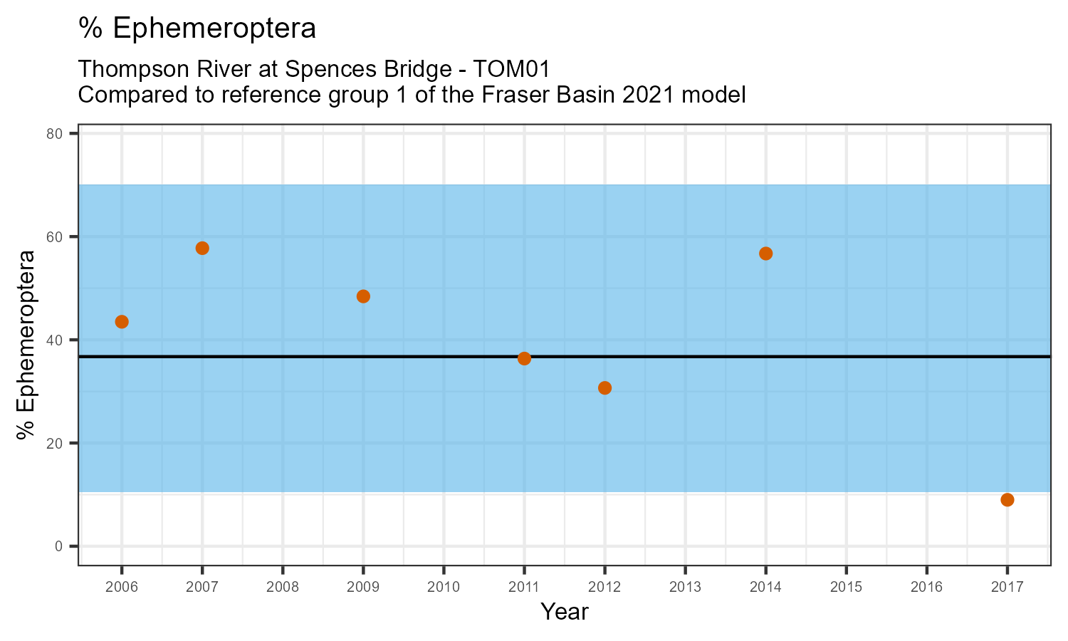 % Ephemeroptera is the proportion of invertebrates that belong to the taxonomic order Ephemeroptera. Ephemeroptera are commonly called mayflies. They are sensitive to pollution. The % Ephemeroptera may decrease in response to habitat disturbances like poor water quality.