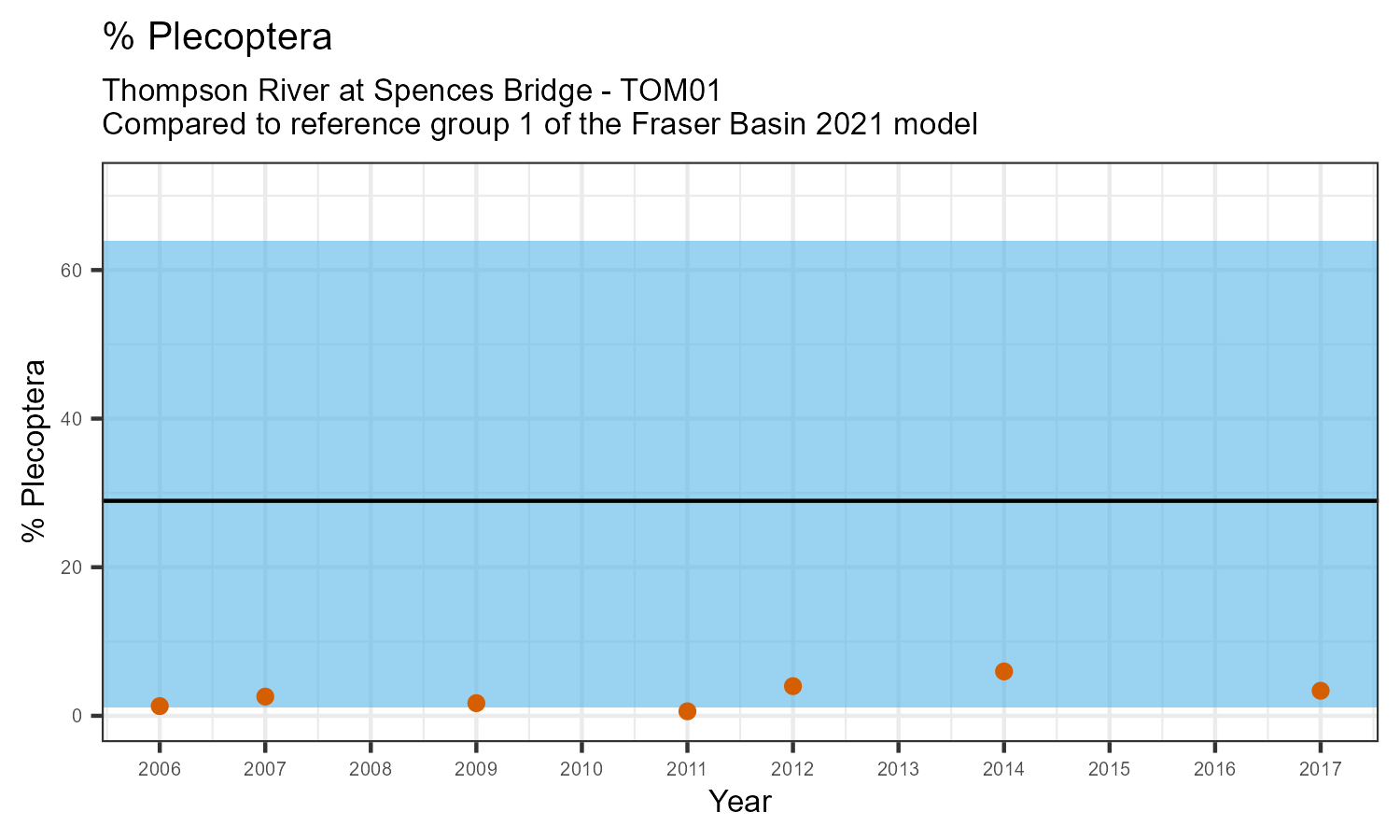 % Plecoptera is the proportion of invertebrates that belong to the taxonomic order Plecoptera. Plecoptera are commonly called stoneflies. They are sensitive to pollution. The % Plecoptera may decrease in response to habitat disturbances like poor water quality.