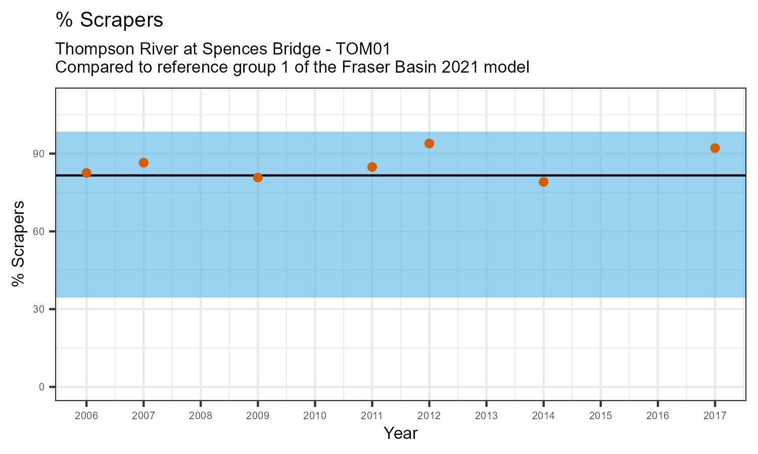 % Scrapers is the proportion of taxonomic familes present that feed by grazing on the algae growing on rocks and other underwater surfaces. The proportion of scrapers is expected to decrease at a site in response to disturbance.