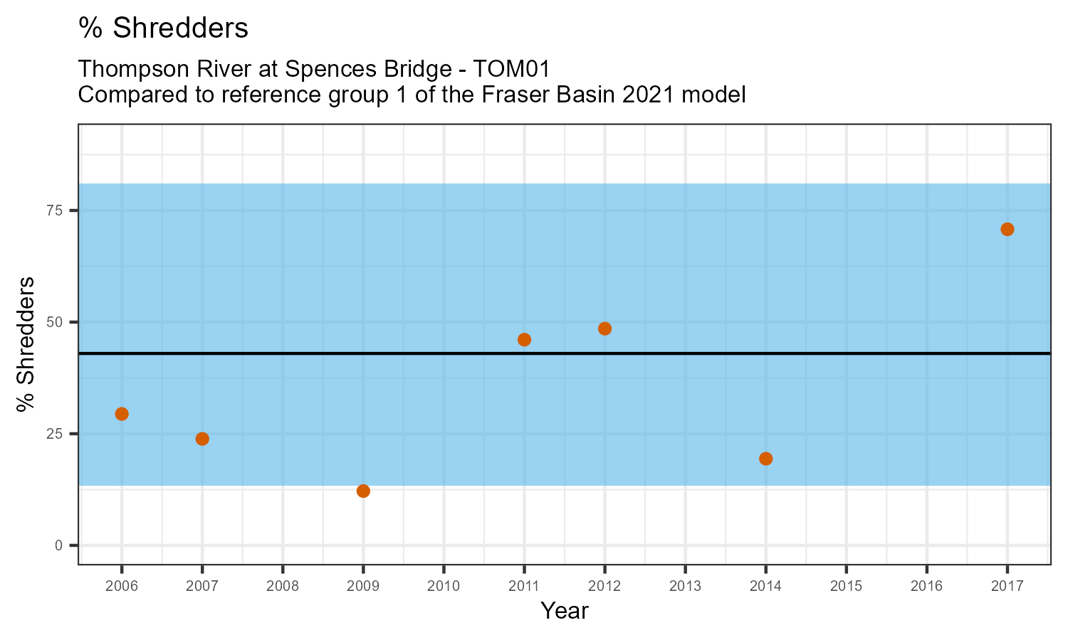 % Shredders is the proportion of taxonomic familes present that feed on leaf litter and other coarse particulate organic matter in the water. The proportion of shredders is expected to decrease at a site in response to disturbance.