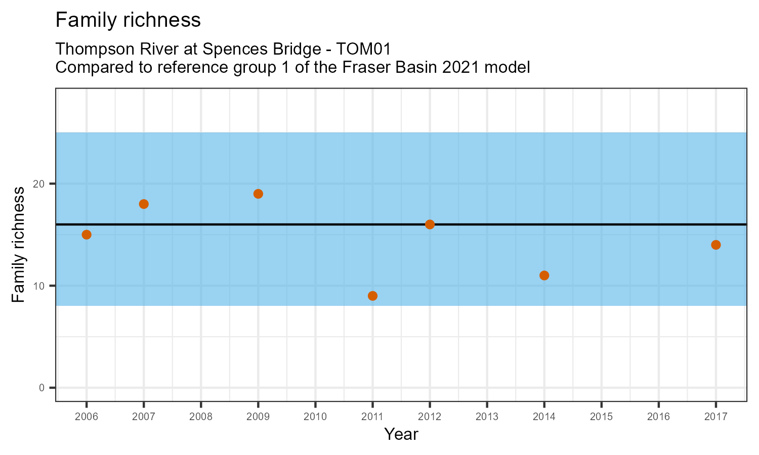 Family richness is the total number of taxonomic families identified. Family richness can decline in response to habitat disturbances or introduction of invasive species.