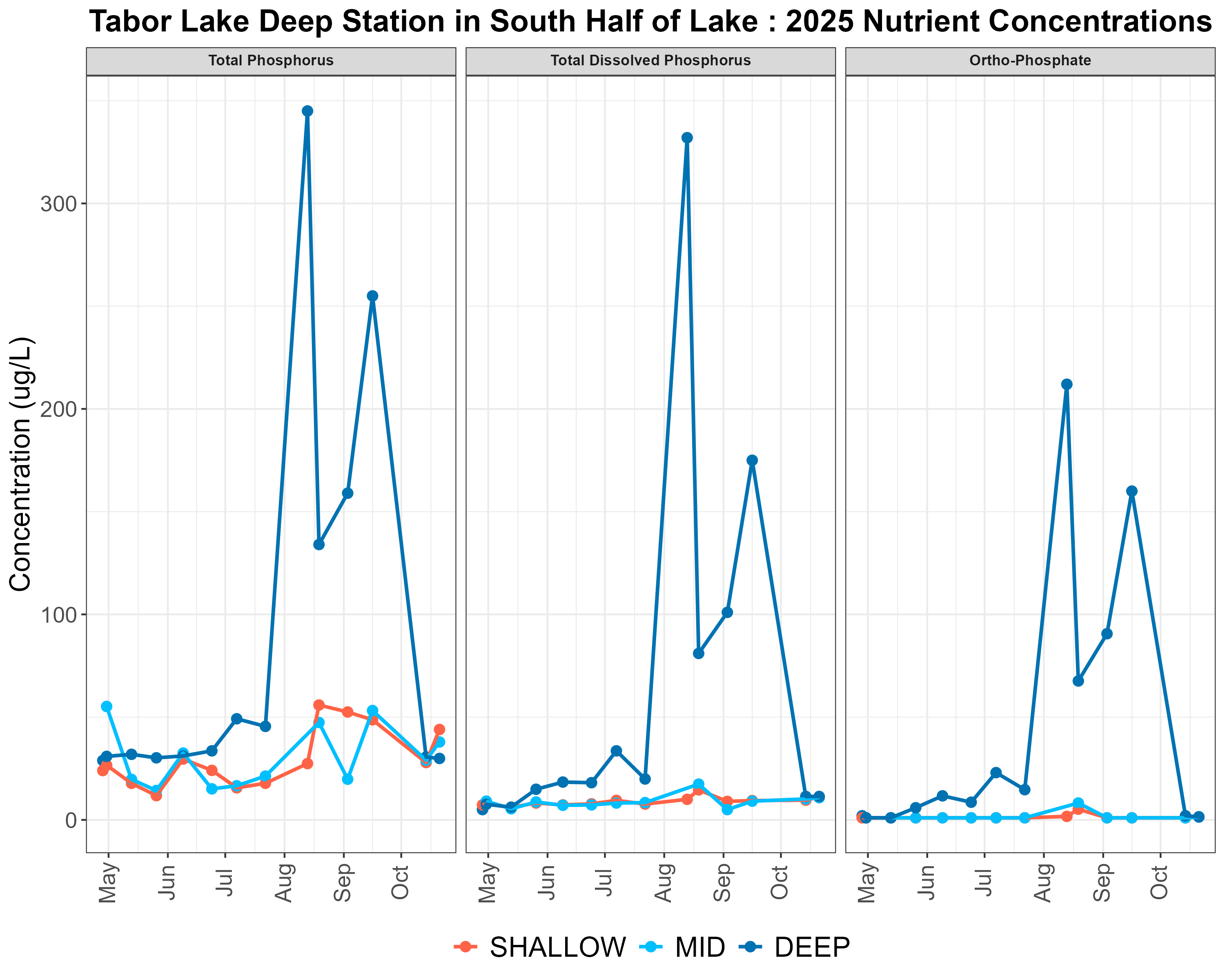 Nitrogen and phosphorus are two of the most important nutrients to lake productivity. Most lakes in B.C. are phosphorus limited, meaning that phosphorus is the nutrient in shortest supply and thus acts to limit the production of aquatic plants and algae. When in excess, phosphorus accelerates growth and may artificially age a lake. Phosphorus exists in both total and dissolved forms. The dissolved form ortho-phosphate is the most bioavailable (easily used) by aquatic plants and algae for growth. Total phosphorus and total dissolved phosphorus are important for understanding how much potentially available phosphorus is in the lake. Examining all three forms provides more detail on the phosphorus loading dynamics of the lake. Level 3 monitoring programs sample water to analyze for total phosphorus, total dissolved phosphorus and ortho-phosphate. The graph below shows the concentrations of each of these during each volunteer sampling event.