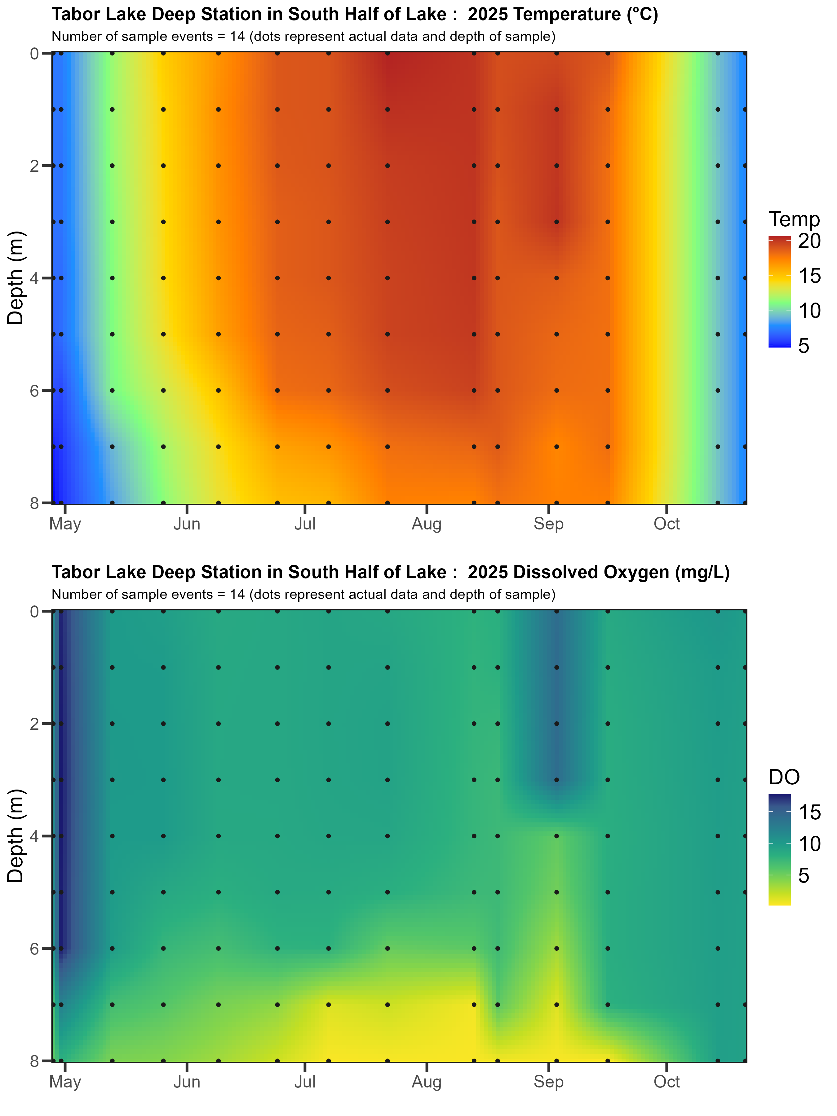 Lake profiles for Tabor Lake were not collected until 2021. Below are temperature and dissolved oxygen plots from data taken at each of the three sampling depths.