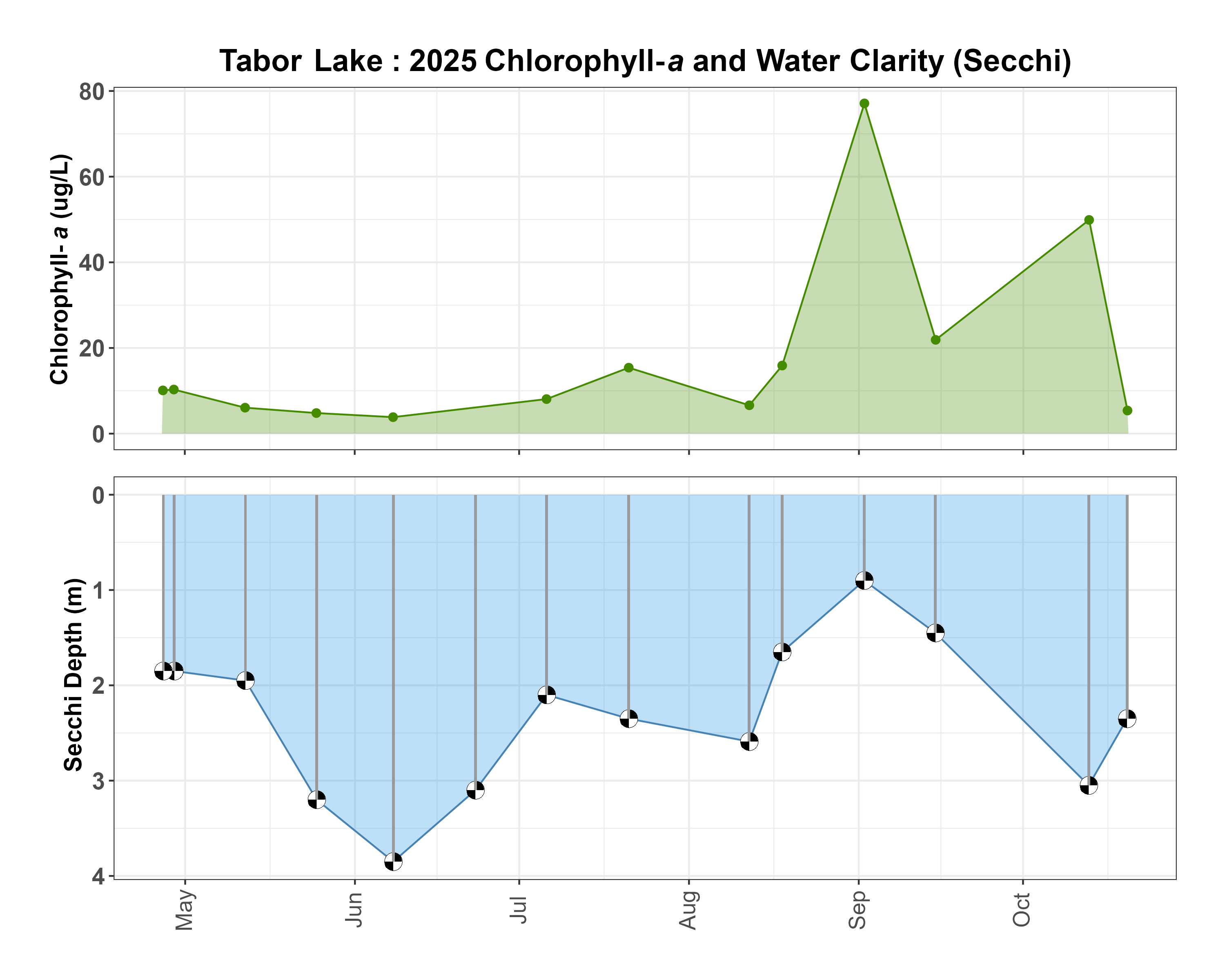 The following figure shows chlorophyll-a concentrations and the corresponding Secchi depths collected by volunteer samplers at each sampling event.