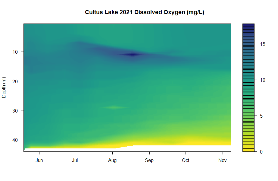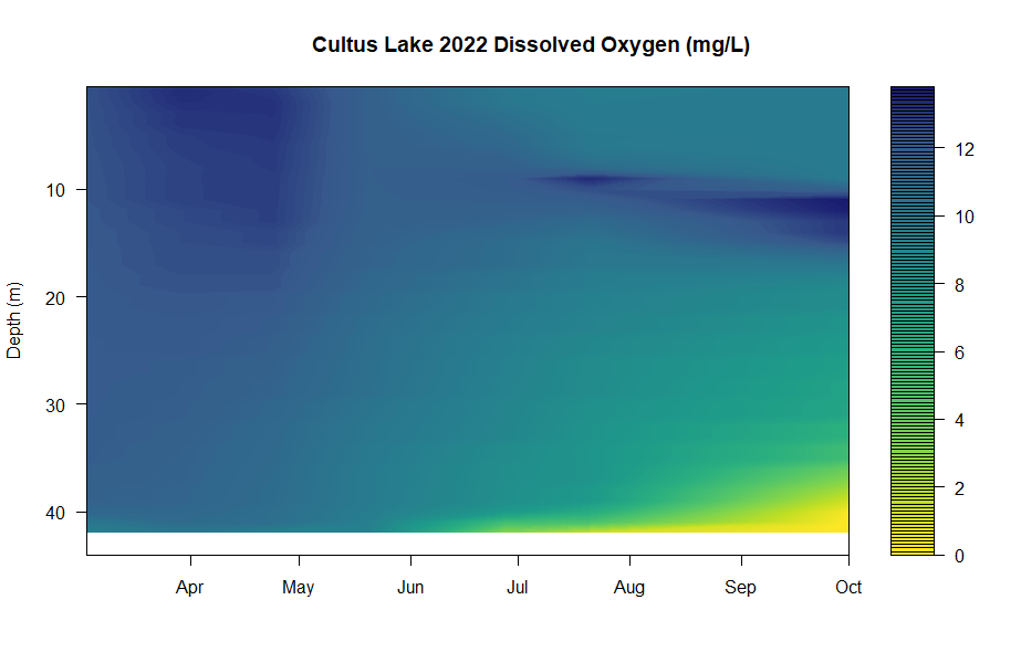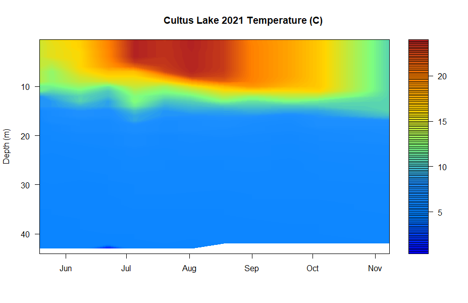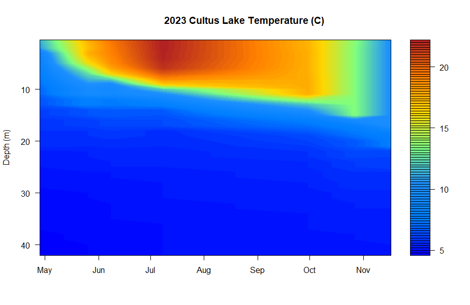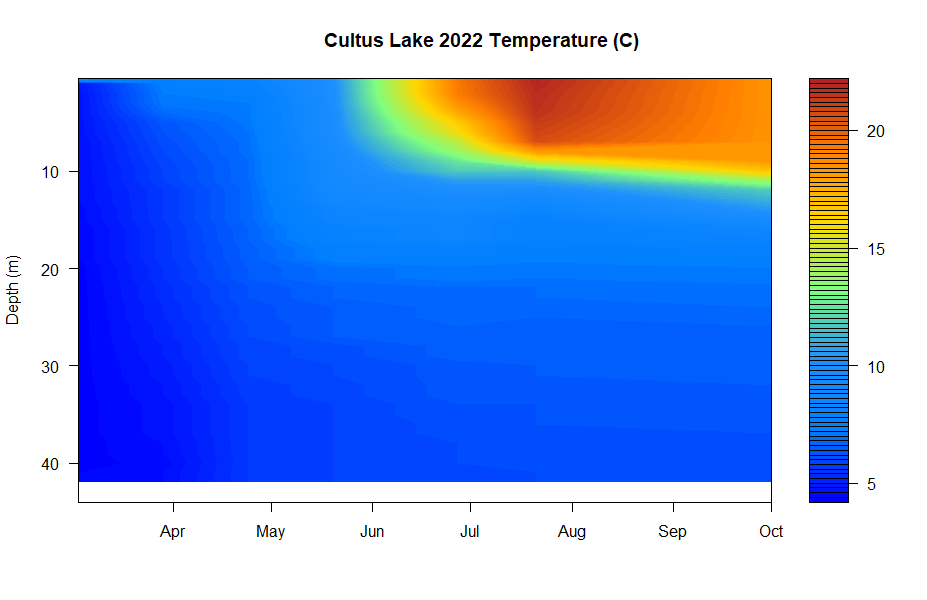Temperature (°C) and dissolved oxygen (mg/L) readings are recorded at 1 m intervals through the lake water column during each volunteer sampling event. The results of these profiles are displayed below in contour plots. Mathematical estimation, or interpolation, is used to create a plot that is easier to visualize the temperature and oxygen patterns at the sample location. This means that all the data shown in the plots between the collected sample points, both the depths and dates, are mathematically estimated from the known values before and after it. The colours in the plots represent temperature and dissolved oxygen gradients. The temperature and oxygen value that matches each colour is shown on the chart along the right side. These plots assist in understanding seasonal lake stratification patterns.