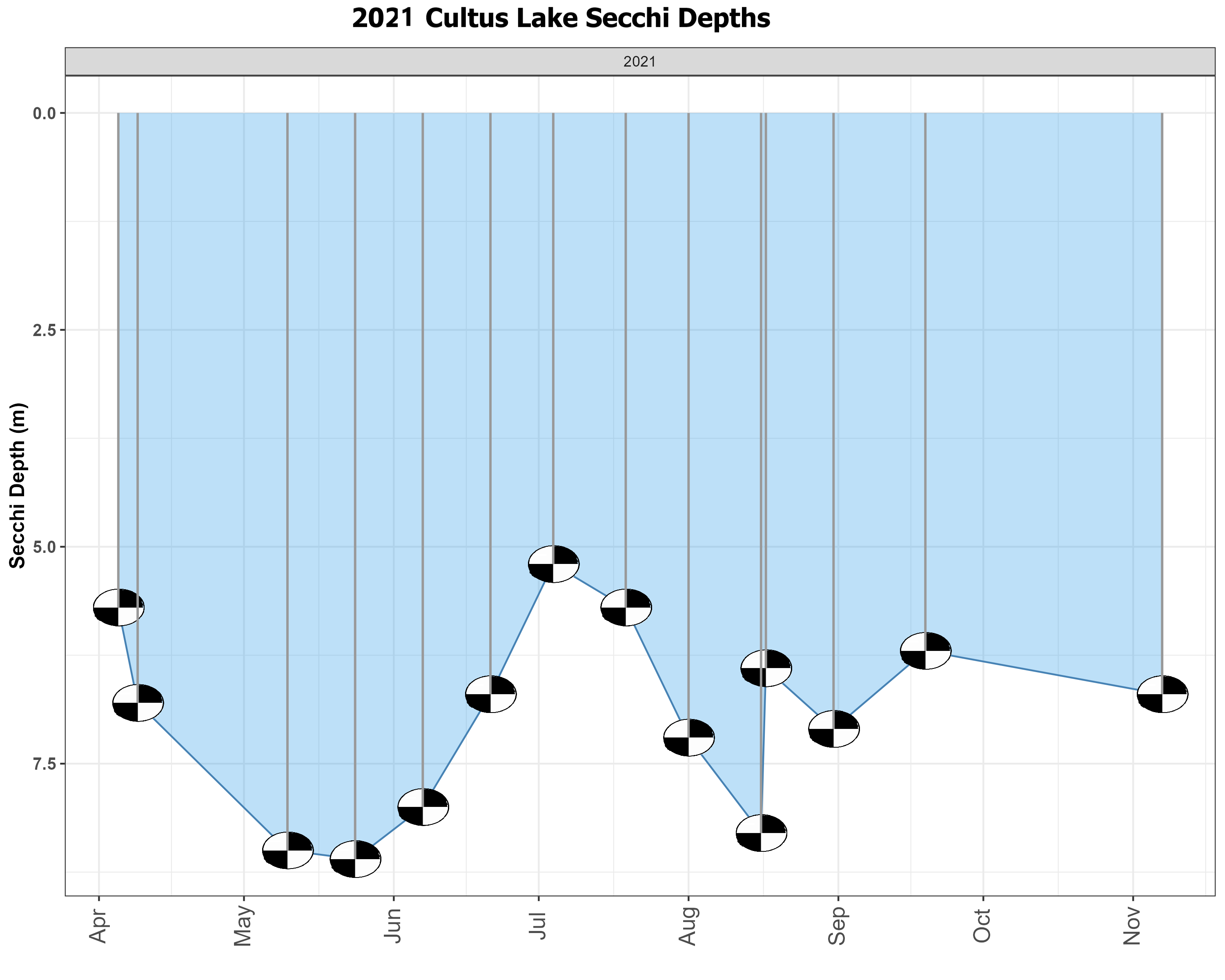 Water clarity is measured using a Secchi disk, with deeper Secchi depth indicating clearer water and shallower Secchi depth indicating less clear water. The Secchi depth can be used as an indicator of the presence of algal cells or other particles in the water column, such as pollen or sediments. The following figure shows the Secchi depths collected at each sampling event.