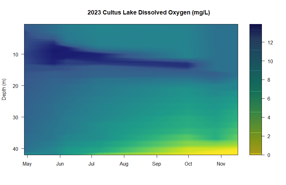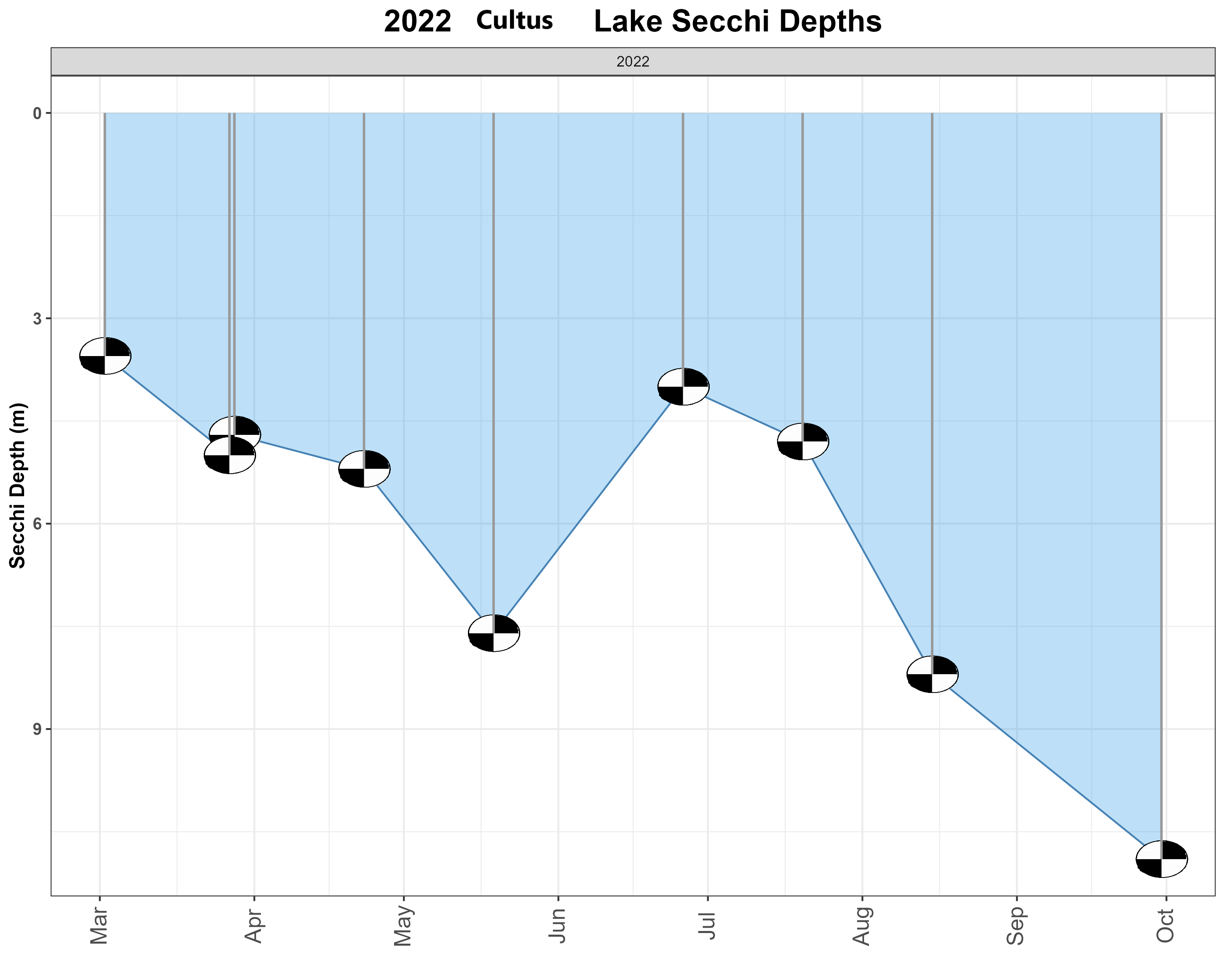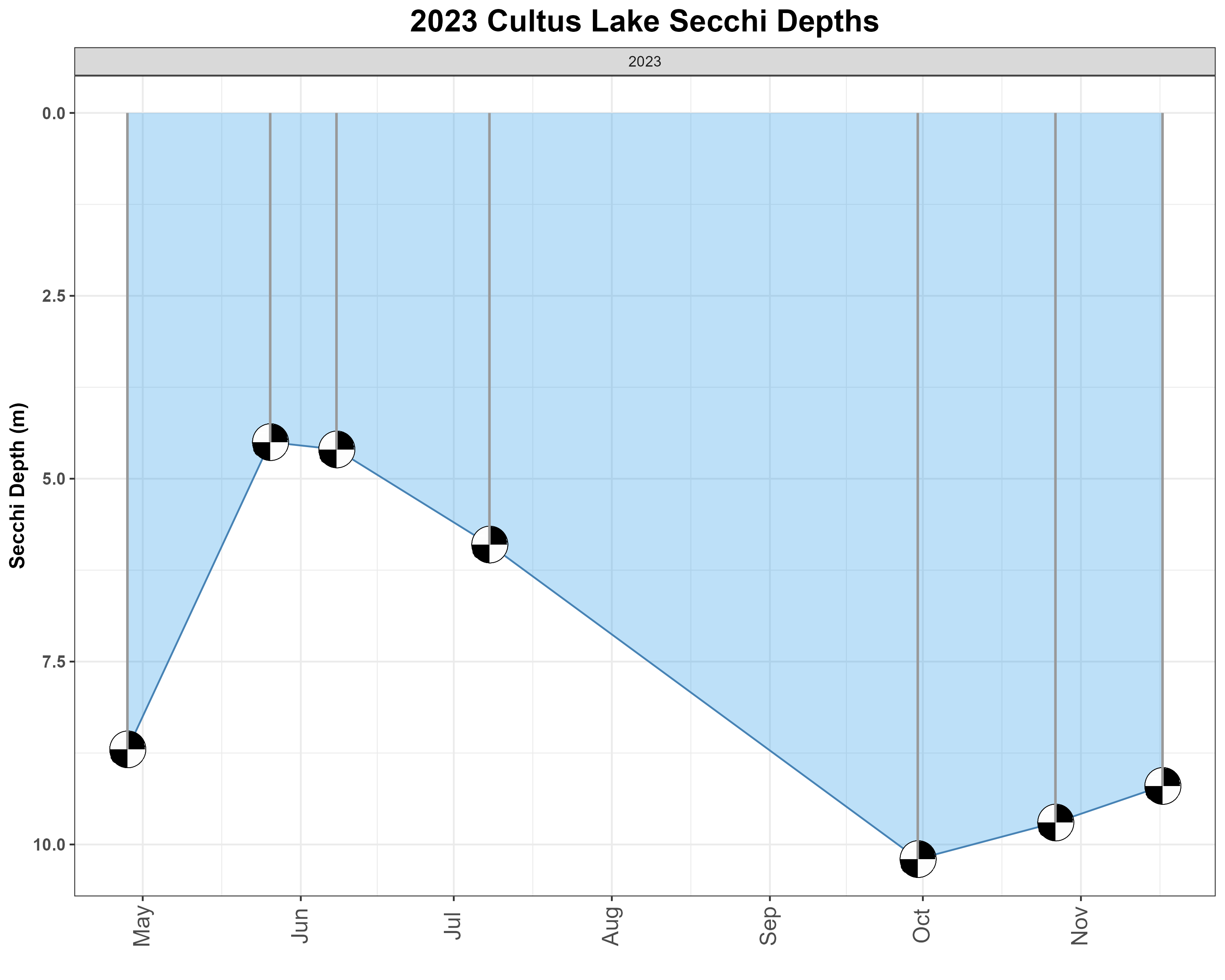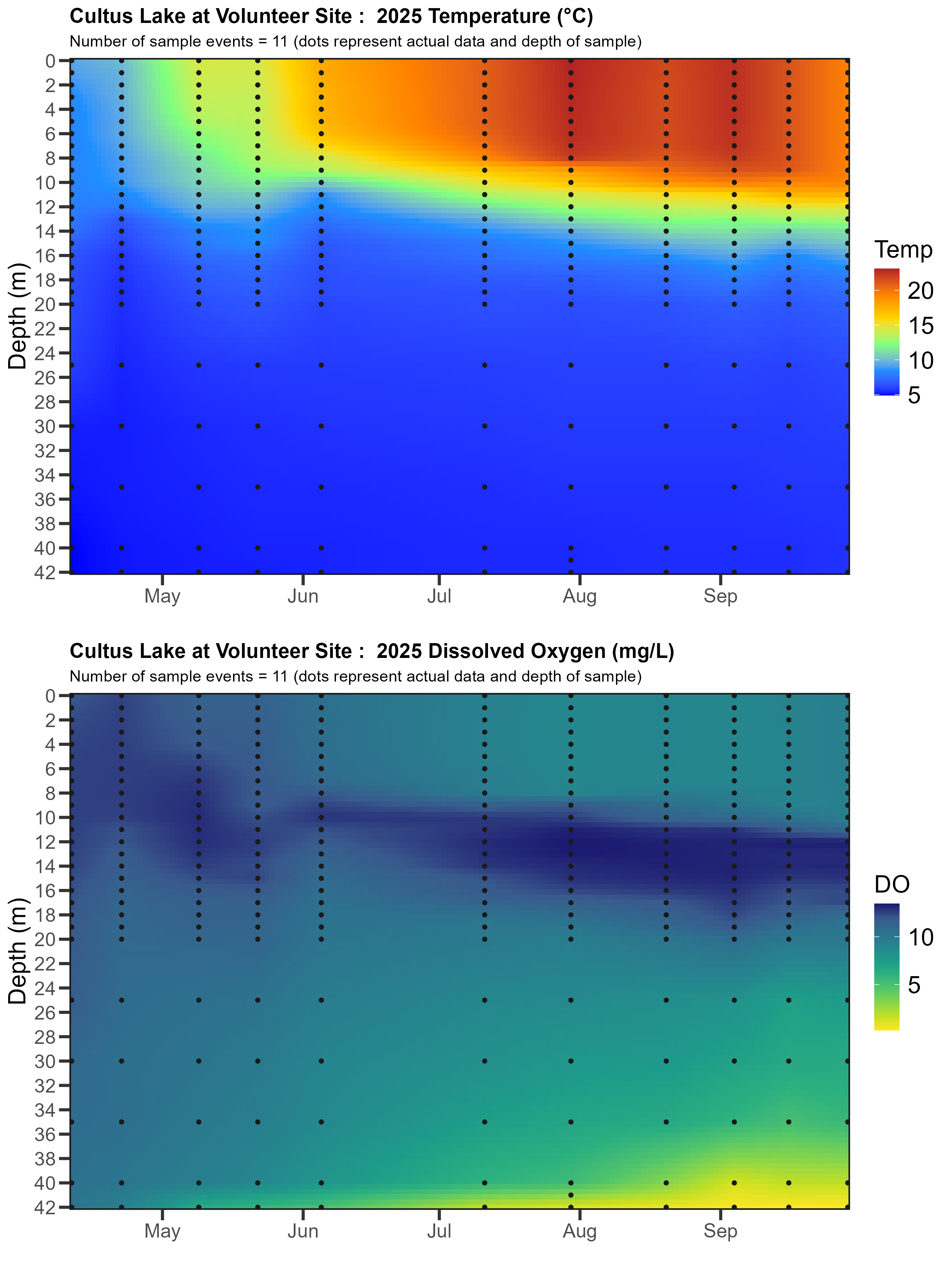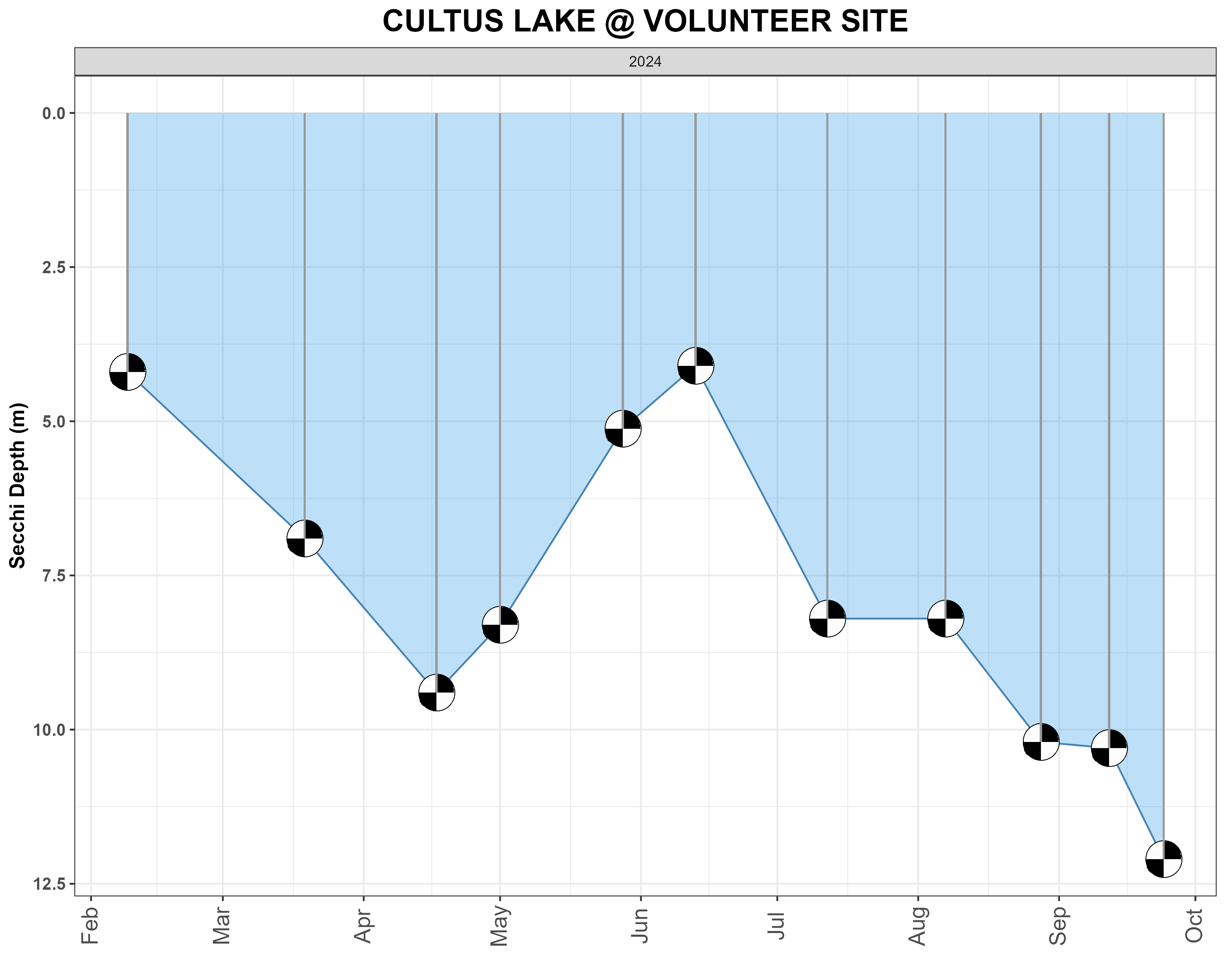 CULTUS LAKE @ VOLUNTEER SITE is monitored at Level 2 and has been sampled since 2022. Level 2 studies are conducted on lakes that are also sampled by the Province under the B.C. Lake Monitoring Network (BCLMN; www.gov.bc.ca/lake-monitoring). BCLSMP data is collected by volunteer citizen scientists, with a target of 12 sampling dates per year during the open water season, and includes Secchi depths (i.e., water clarity) and temperature and dissolved oxygen profiles. BCLMN data is collected by ENV twice a year: once in late winter/spring (February to May, depending on location and ice melt) when the water column is in mixed conditions and once in the late summer/fall (August to September) when the water column is stratified. This sampling includes Secchi depths, temperature and dissolved oxygen profiles, nutrients, and algal biomass indicator (i.e., chlorophyll-a) data. When combined, these data provide information on the water quality conditions of the lake throughout the ice-free season and help understand important lake characteristics including summer oxygen depletion and productivity.