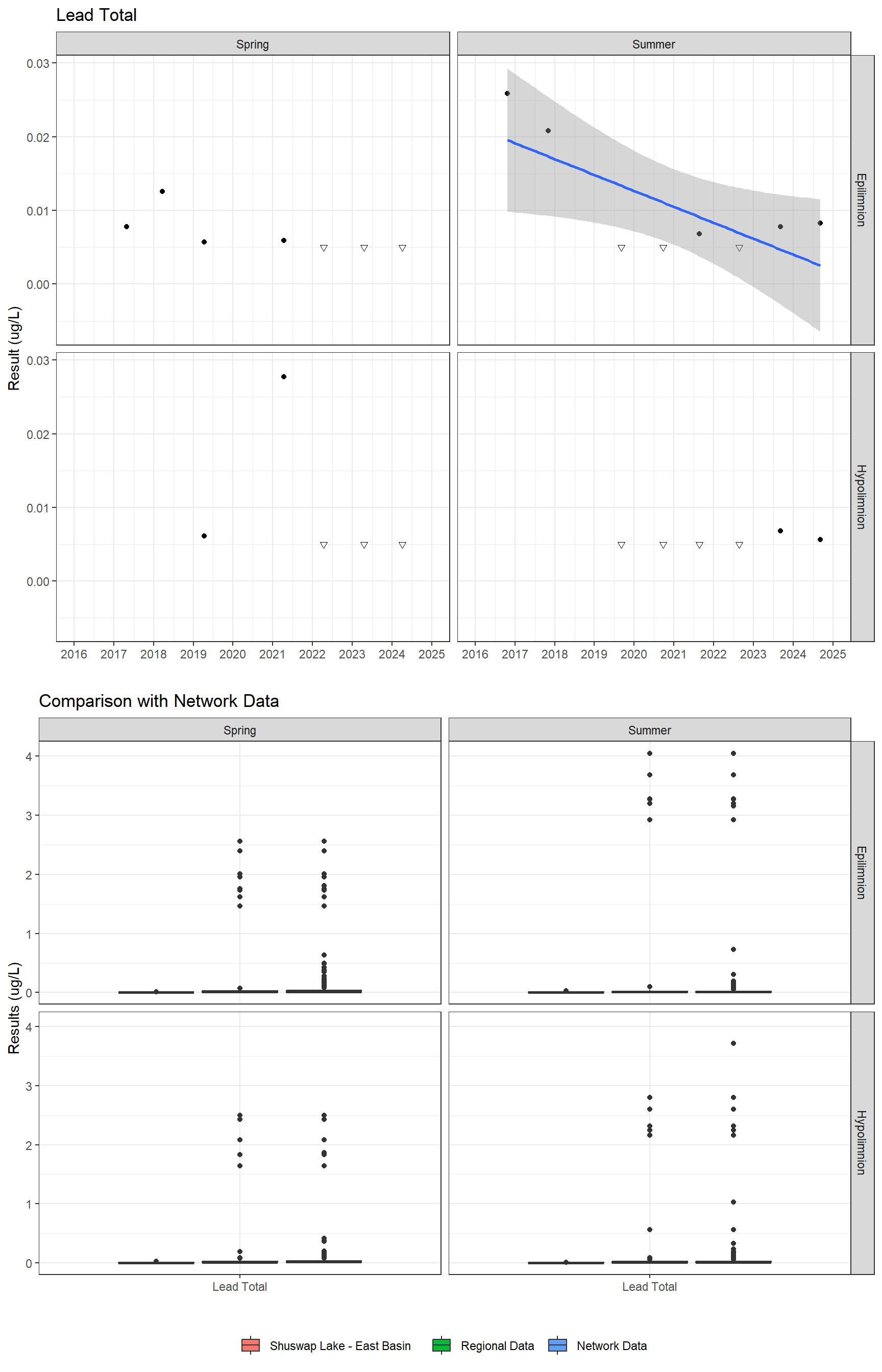 The sample results presented below are grouped into five main categories (Field, General, Major Ions, Nutrients, and Metals – Total), then the data are sorted by season and depth. Click through the tabs below to see results over time for each parameter. Results where the analyte is below the laboratory detection limit (i.e. the amount of analyte in a sample is so small it cannot be measured) are indicated with an open downward facing triangle (▽) drawn at the detection limit, the true value is unknown but is known to be less than the detection limit.