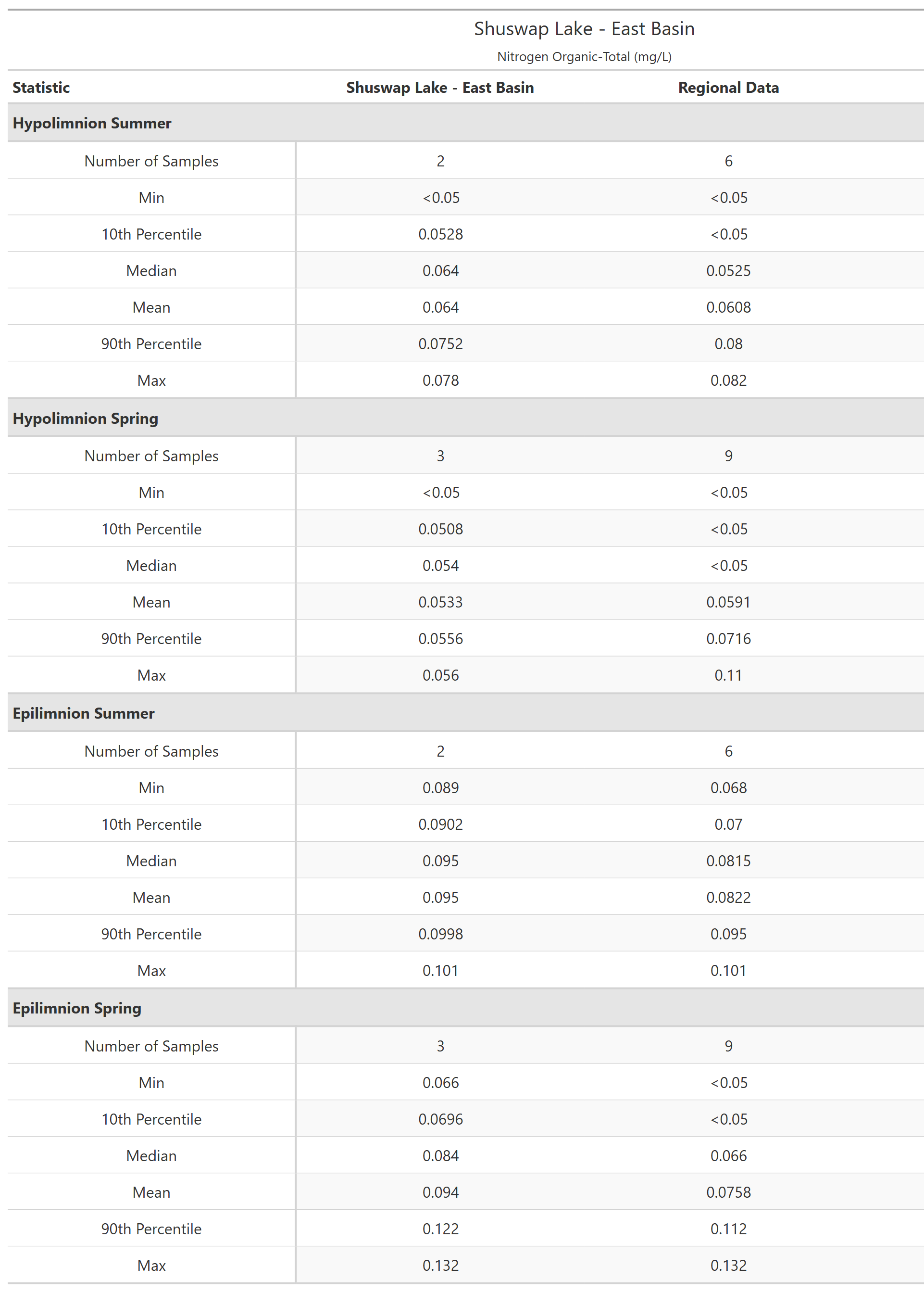 Shuswap Lake - East Basin (0500124) is in the Columbia Mountains limnological region. The recent sampling history at this site is shown in below. Composite samples (water from three depths are mixed together into a single sample) are indicated by a vertical line connecting the uppermost and lowermost sampling depths. The shape of the points indicates if the samples are from of the epilimnion (upper layer; indicated with triangles ▲) or hypolimnion (bottom layer; indicated with solid circles ●) of the lake. For lakes less than 10 m deep composite sampling is not done, instead a single sample 1 m below the surface represents the epilimnion and one sample 1 m off the bottom represents the hypolimnion.