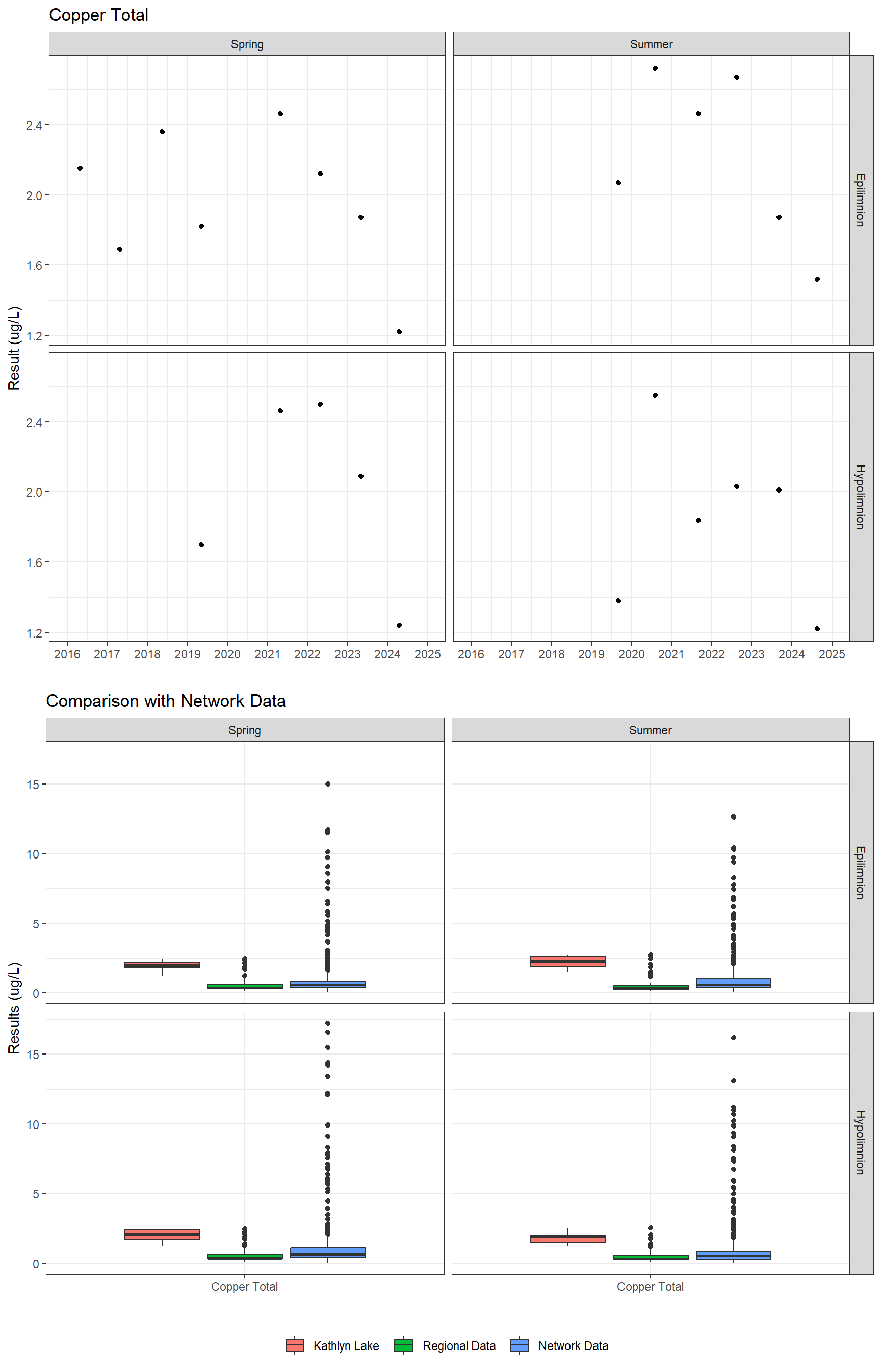 The sample results presented below are grouped into five main categories (Field, General, Major Ions, Nutrients, and Metals – Total), then the data are sorted by season and depth. Click through the tabs below to see results over time for each parameter. Results where the analyte is below the laboratory detection limit (i.e. the amount of analyte in a sample is so small it cannot be measured) are indicated with an open downward facing triangle (▽) drawn at the detection limit, the true value is unknown but is known to be less than the detection limit.
