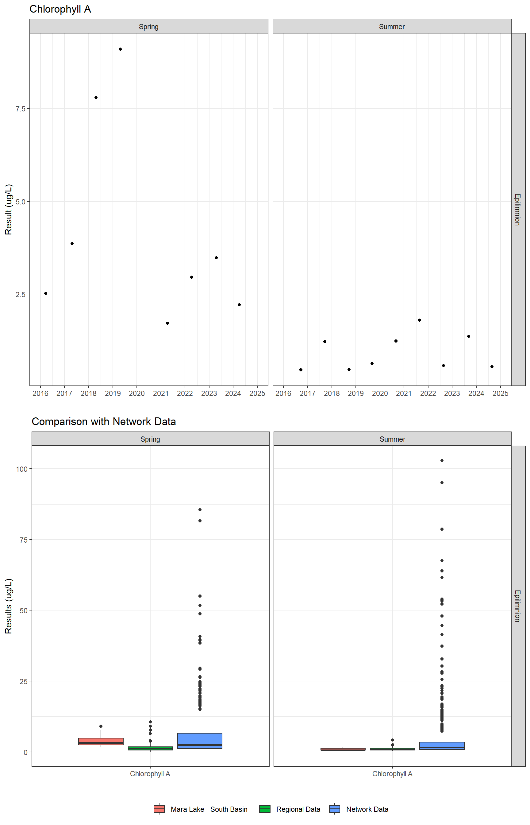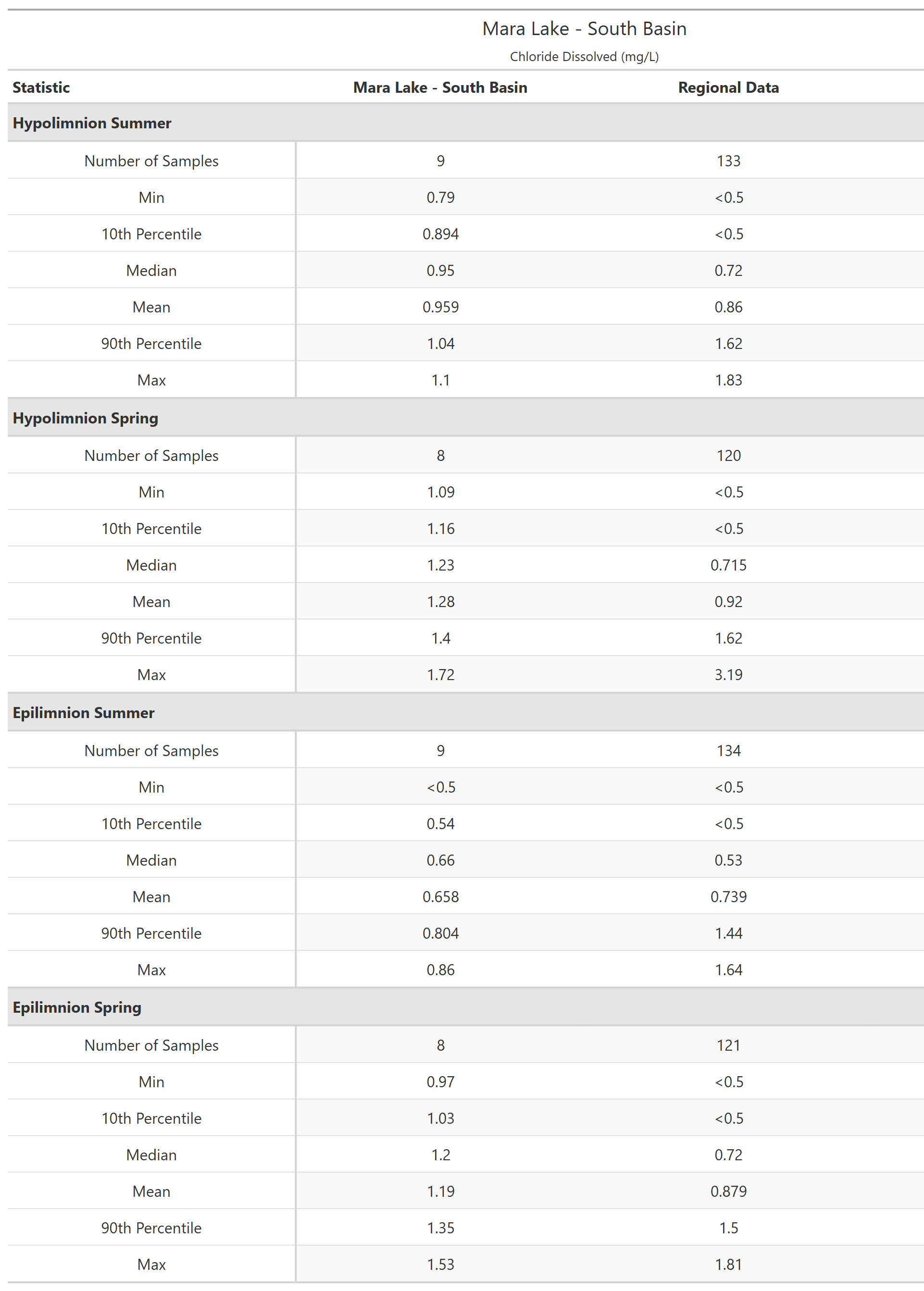 The sample results presented below are grouped into five main categories (Field, General, Major Ions, Nutrients, and Metals – Total), then the data are sorted by season and depth. Click through the tabs below to see results over time for each parameter. Results where the analyte is below the laboratory detection limit (i.e. the amount of analyte in a sample is so small it cannot be measured) are indicated with an open downward facing triangle (▽) drawn at the detection limit, the true value is unknown but is known to be less than the detection limit.