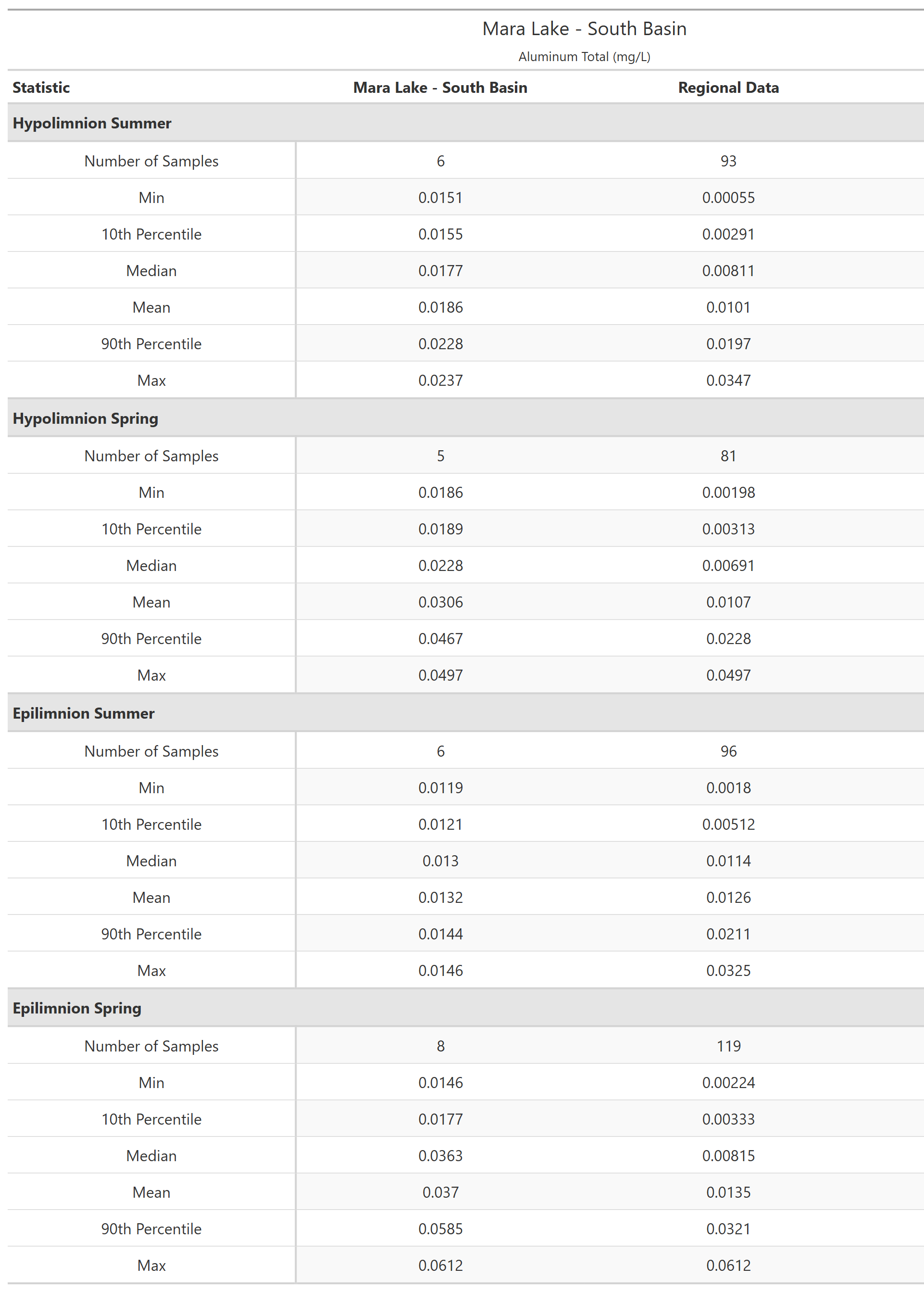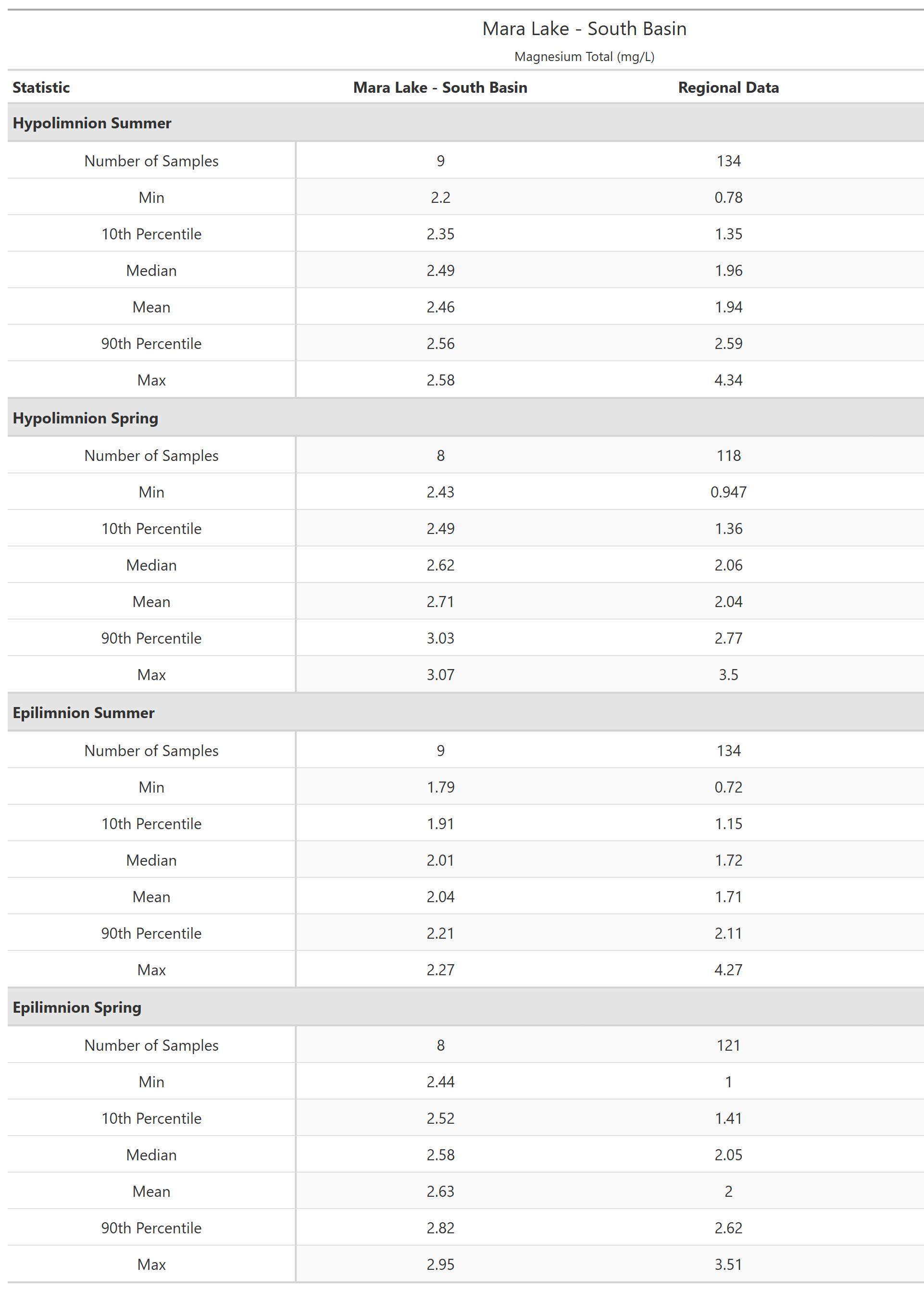Mara Lake - South Basin (E285689) is in the Columbia Mountains limnological region. The recent sampling history at this site is shown in below. Composite samples (water from three depths are mixed together into a single sample) are indicated by a vertical line connecting the uppermost and lowermost sampling depths. The shape of the points indicates if the samples are from of the epilimnion (upper layer; indicated with triangles ▲) or hypolimnion (bottom layer; indicated with solid circles ●) of the lake. For lakes less than 10 m deep composite sampling is not done, instead a single sample 1 m below the surface represents the epilimnion and one sample 1 m off the bottom represents the hypolimnion.
