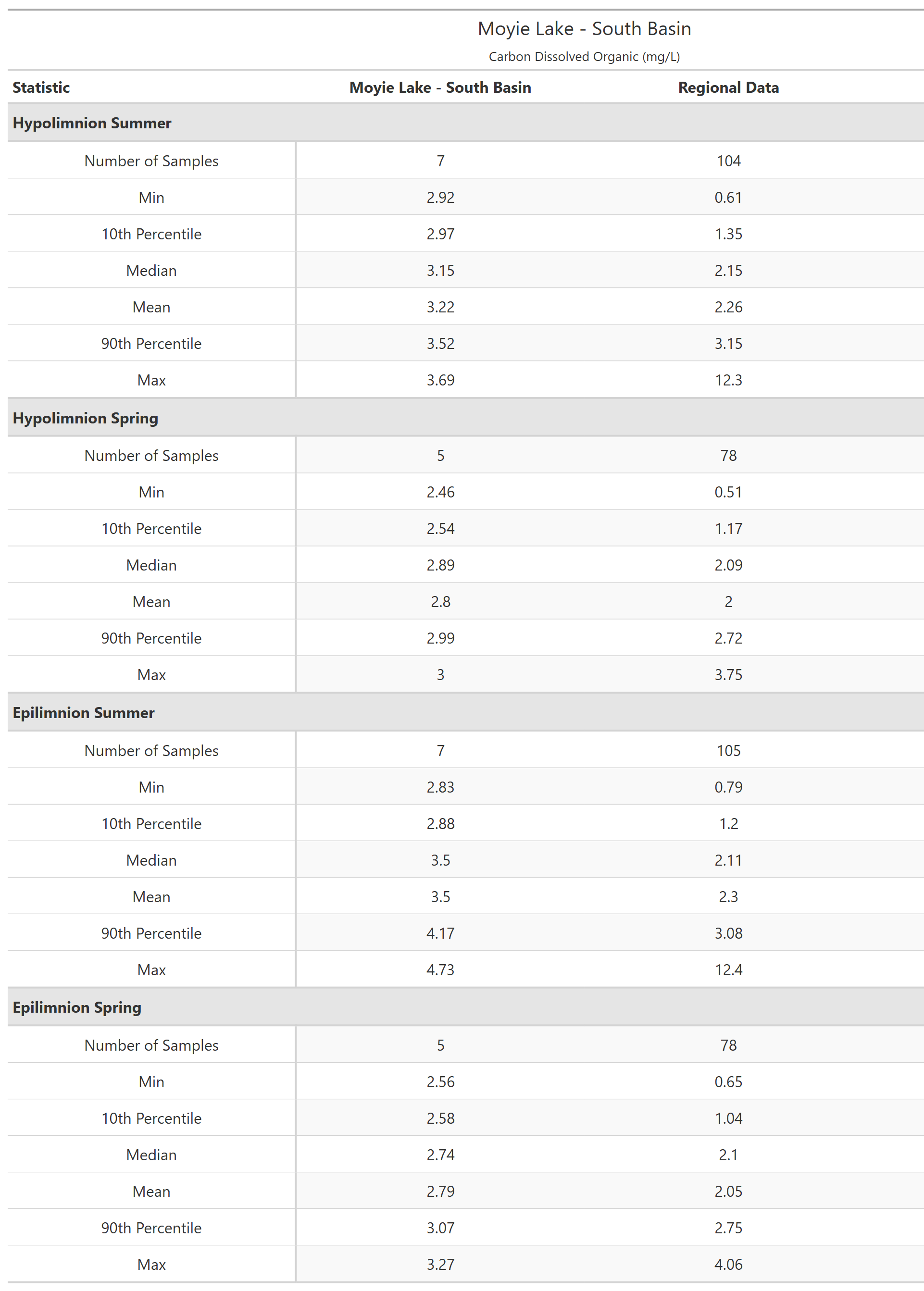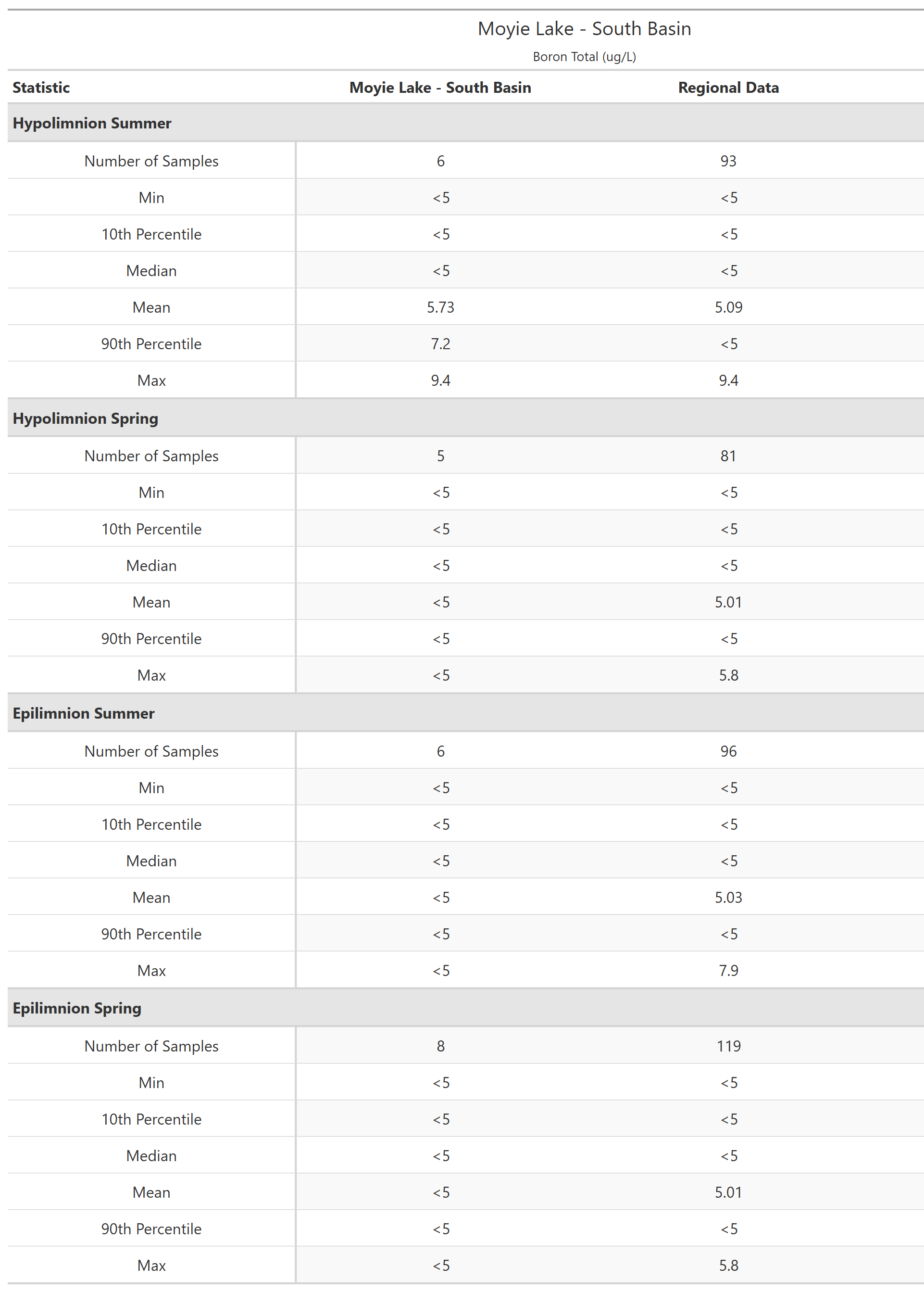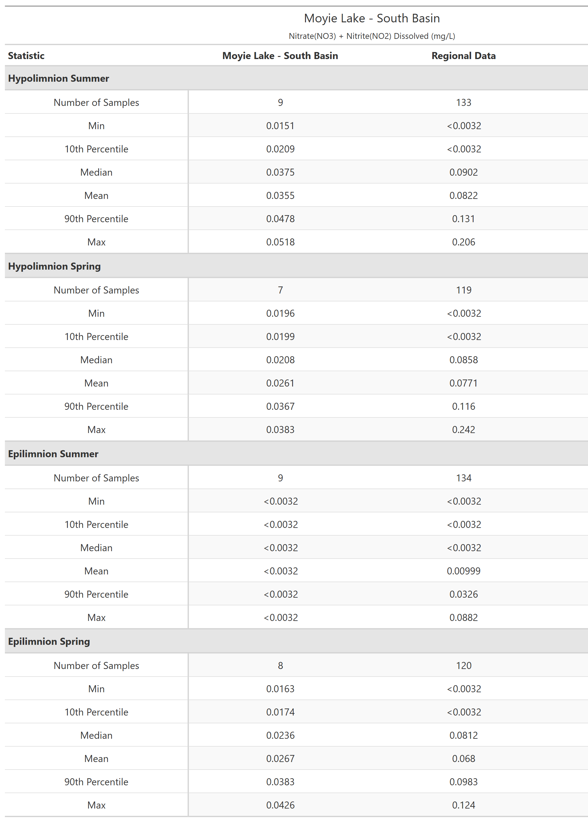 Moyie Lake - South Basin (E301591) is in the Columbia Mountains limnological region. The recent sampling history at this site is shown in below. Composite samples (water from three depths are mixed together into a single sample) are indicated by a vertical line connecting the uppermost and lowermost sampling depths. The shape of the points indicates if the samples are from of the epilimnion (upper layer; indicated with triangles ▲) or hypolimnion (bottom layer; indicated with solid circles ●) of the lake. For lakes less than 10 m deep composite sampling is not done, instead a single sample 1 m below the surface represents the epilimnion and one sample 1 m off the bottom represents the hypolimnion.